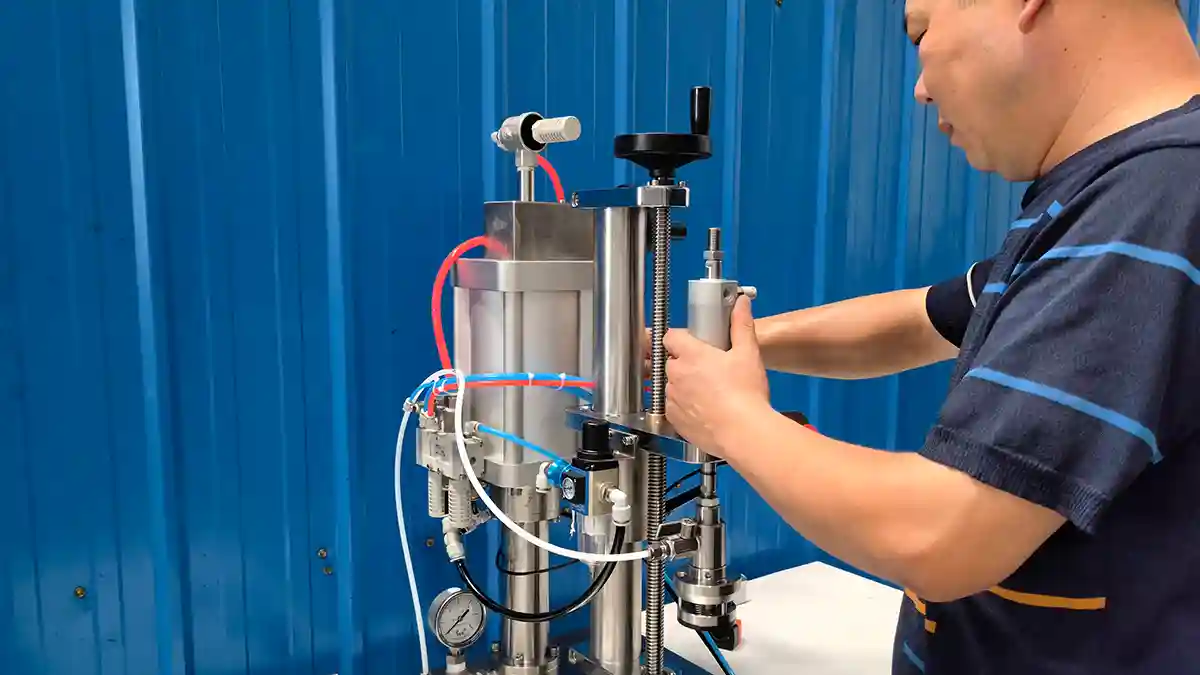 This semi-automatic aerosol filling machine is designed for easy operation on a single workstation, making it ideal for entry-level and small production needs. It includes the essential functions of liquid filling, sealing and gas filling. The machine accommodates various can sizes and filling volumes, allowing for quick and convenient adjustments to meet different requirements.