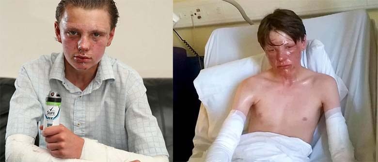 Kyle and a friend were playing a Sure aerosol with a cigarette lighter to mimic the flamethrower. But the accident happened at that time. The deodorant aerosol spray exploded and Kyle was almost turning into a fireball. This 14-year-old schoolboy suffered serious burning injury.